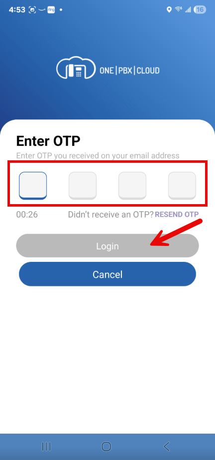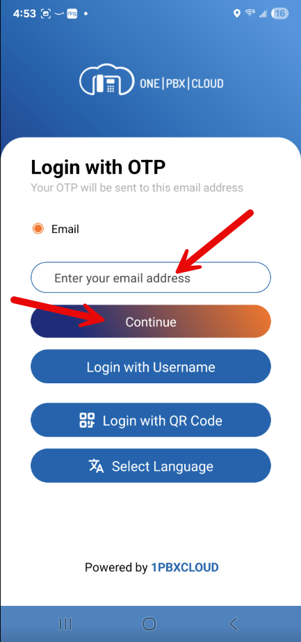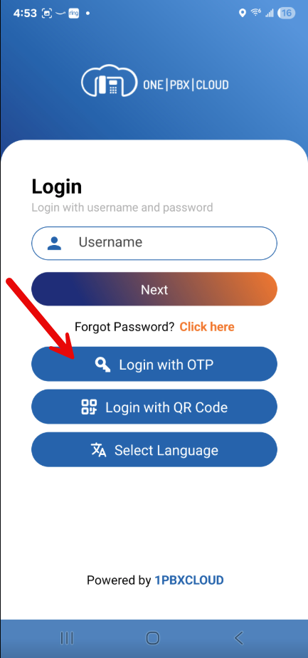 - Once on the login screen, tap on OTP and enter the email associated with your extension. A one time code will be sent to the email. Enter it and tap on “Login”